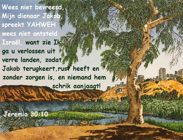 10 Gij dan, vrees niet, mijn knecht Jakob, luidt het woord des Heren, en wees niet verschrikt, Israël, want zie, Ik verlos u uit verre streken, uw nakroost uit het land hunner gevangenschap; Jakob zal terugkeren en rustig en veilig zijn, door niemand opgeschrikt. 11 Want Ik ben met u, luidt het woord des Heren, om u te verlossen; want Ik zal met alle volken waaronder Ik u verstrooid heb, voorgoed afrekenen, maar met u zal Ik niet voorgoed afrekenen, doch naar recht u tuchtigen, al zal Ik u zeker niet vrij laten uitgaan.