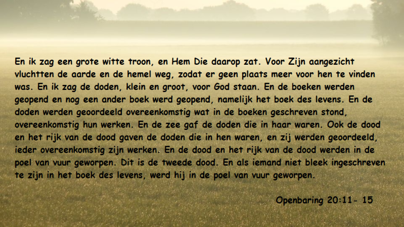 Openbaring 20:11 t/m15 “En ik zag een grote witte troon en Hem, die daarop gezeten was, voor wiens aangezicht de aarde en de hemel vluchtten, en geen plaats werd voor hen gevonden. En ik zag de doden, de groten en de kleinen, staande voor de troon, en er werden boeken geopend. En nog een ander boek werd geopend, het (boek) des levens; en de doden werden geoordeeld op grond van hetgeen in de boeken geschreven stond, naar hun werken. En de zee gaf de doden, die in haar waren, en de dood en het dodenrijk gaven de doden, die in hen waren, en zij werden geoordeeld, een ieder naar zijn werken. En de dood en het dodenrijk werden in de poel des vuurs geworpen. Dat is de tweede dood: de poel des vuurs. En wanneer iemand niet bevonden werd geschreven te zijn in het boek des levens, werd hij geworpen in de poel des vuurs.”